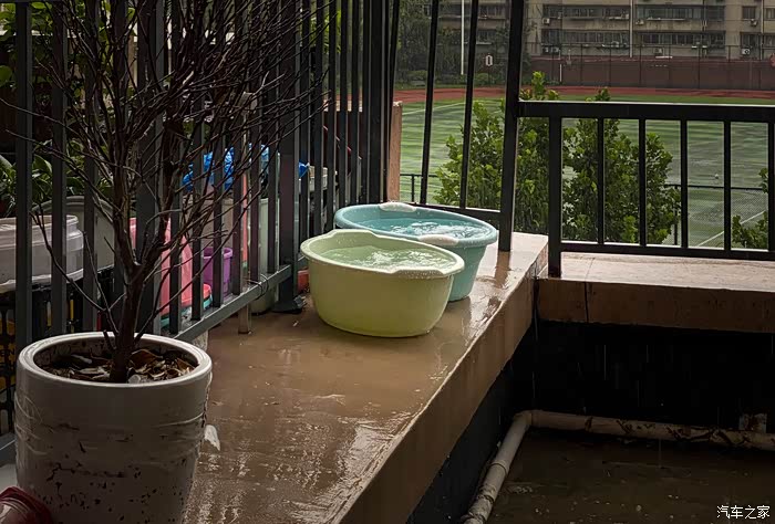 7月21日早上(第二天),阳台上的两个脸盆接满了雨水,用来冲厕所。