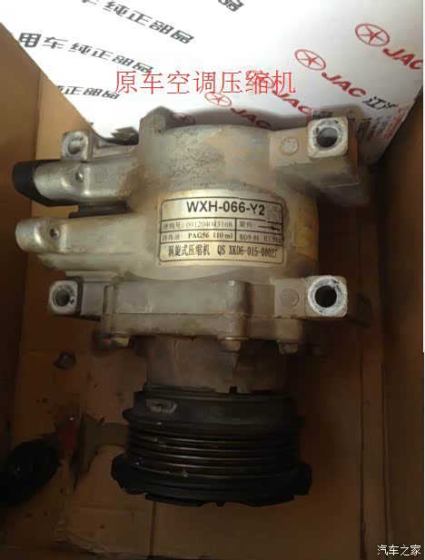 同悦1.3手动空调压缩机型号规格:WXH-066-YA2, 厂家标签:JAC