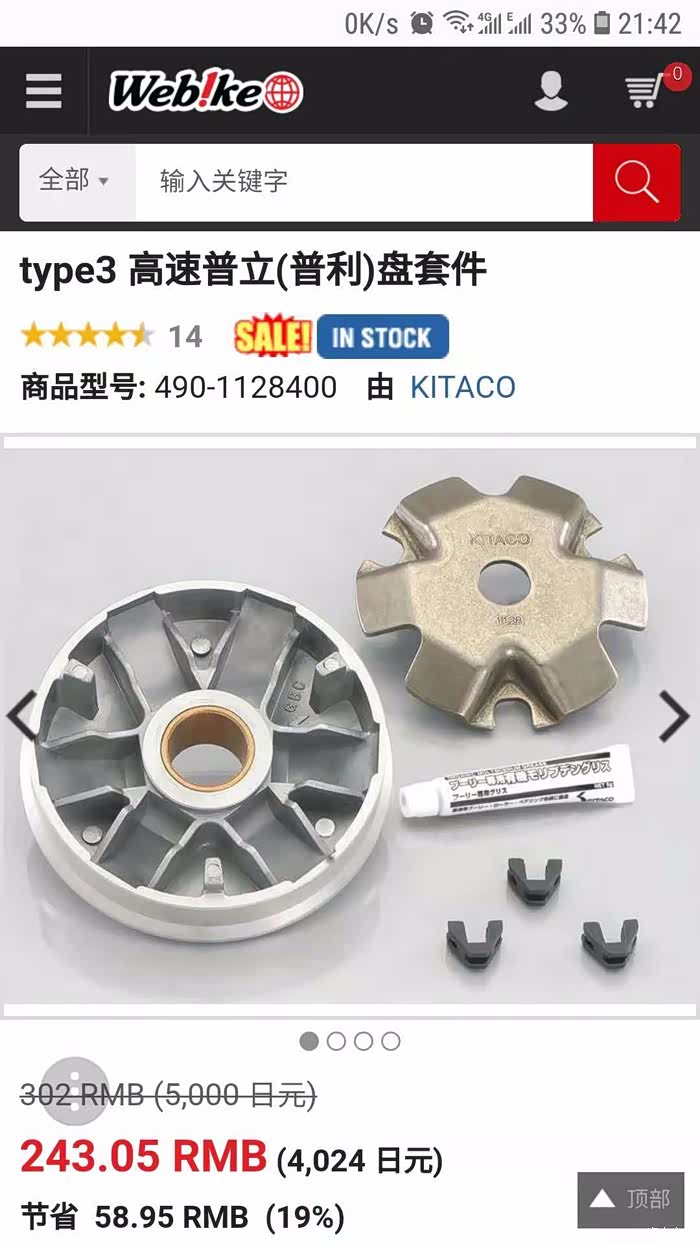 前段时间转日亚,无意中发现有很多国内没有改装件,其中就有kitaco的高速普利盘,能提高自由的尾速,自由的速度本来就是短板,决定一试,从日亚买还得找转运公司,后来发现可以从WEBIKE买,价格也基本差不多,省了很多事