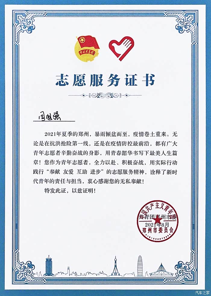 郑州的720特大暴雨,让各企业各单位也都损失惨重,道路上全是积水,也是多亏提了新车,还是个SUV,于是自然担起了志愿运送物资的任务,那几天真的是各种跑,给前线送物资,帮市民过水坑等等等等,我的新车也是跟着我连车牌都还没上就经历了这么多,也不知涉过多少次水,每一次都把我心疼的呀。。。不过我也是心里有数的,只会淌四五十厘米深的水,车速也保持在5公里/小时,启停也都关掉,最后也算是圆满完成任务,车也没有任何损坏,跟郑州人民一起度过了难关!最后共青团郑州市委给颁发了证书,我相信这是我的新车和我最有意义的一段经历!