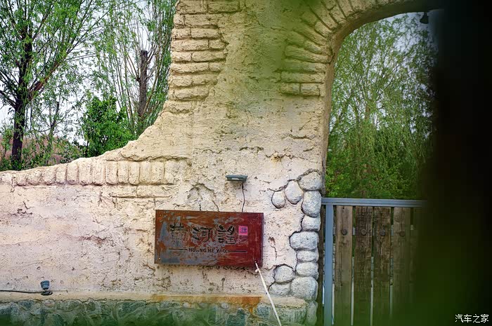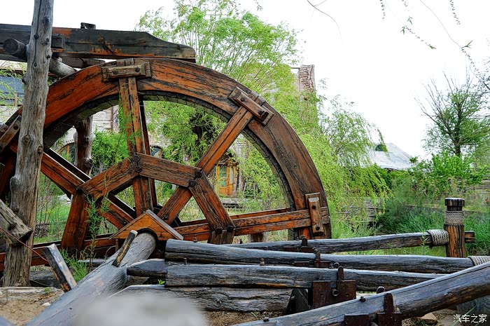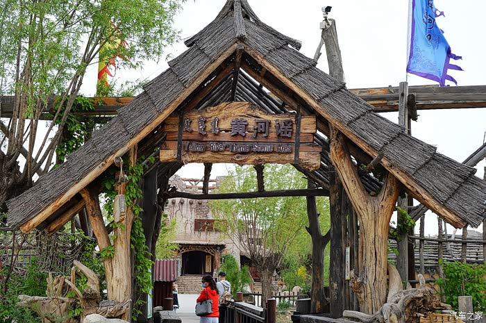驾车在九原区哈林格尔镇的乡村小道上行驶,道路两旁树林繁茂、曲径通幽,离得老远就能看到一架高大的水车在和煦的夏风中吱扭吱扭地转个不停,我们目的地到了——黄河谣。黄河谣景区大门采用了黄土砌成的拱门造型,并做了仿旧的处理,使人仿佛回到了阡陌纵横的农耕时代,给人带来一种历史沧桑感。
