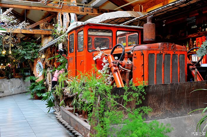贯穿整个餐厅顶部的核心龙骨采用传统的大木结构,吧台前面的这台威风凛凛、极具农耕文化的拖拉机,其实是村里第一台“东方红拓荒牛”,看着还是十分霸气的。