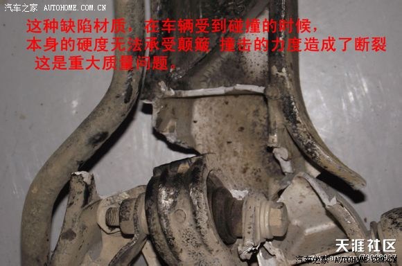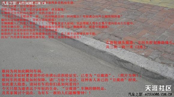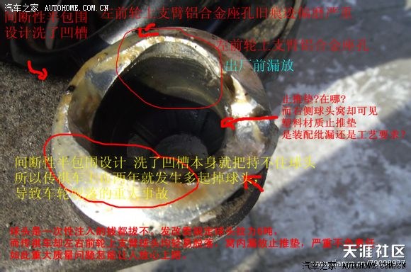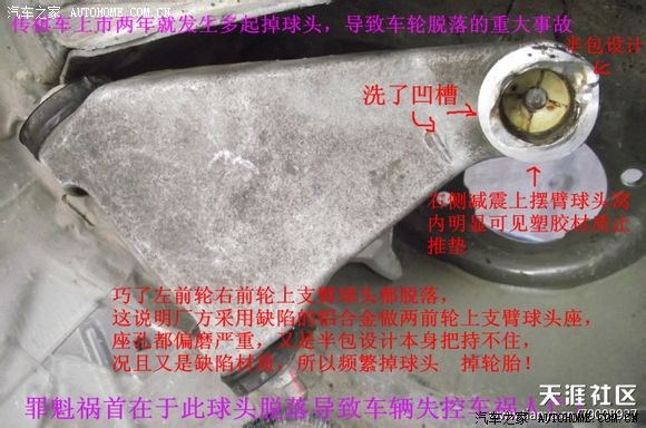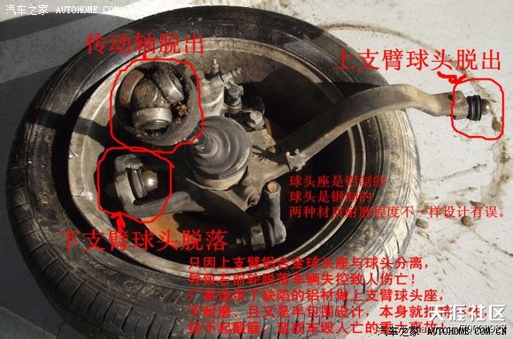 据**报道提示(一旦行驶车辆制动失灵,可利用护栏、路缘石等迫使车辆慢慢减速,危害降至最低)。传祺车可好一撞护栏车轮就掉,假设如厂家所说,亚运会传祺车是撞铁护栏造成掉前车轮,那么假设这次事故车辆是撞击路缘石造成掉右前轮,请问厂方,我们的车左前轮上支臂球头又是为什么掉的?更惊奇的是座孔内出厂前漏放耐磨垫,严重不负责任。发改委明文规定球头的撞击拉力是多少?难道厂方不清楚吗?6吨、6吨呐!别再狡辩,传祺车这么不经颠簸不经撞击,难道不是缺陷问题吗?
