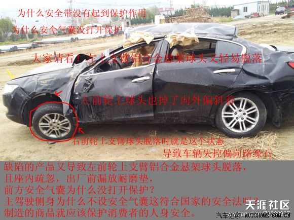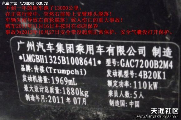 短短几个月时间,25岁年轻人的生命被定格。买了不到一年的新车传祺牌2.0轿车,总程1.3万公里,购于2011年11月16日,定时于4S店保养,于2012年10月27日,在宽阔平坦,宽度为21.4米的道路,发生了惨不忍睹的轿车侧翻人亡重大事故!当事人证件齐全驾驶传祺轿车向左变道中,突然右前轮上支臂铝合金悬架球头脱落,车辆完全失控,偏向路缘导致右前轮脱落,车毁人亡的重大事故!