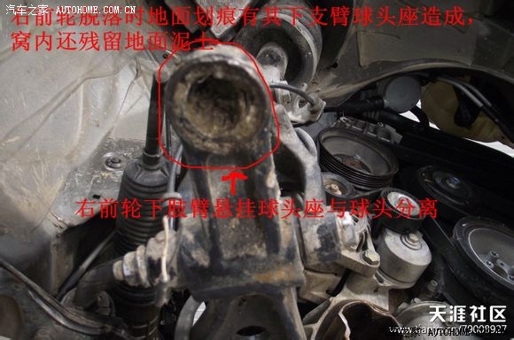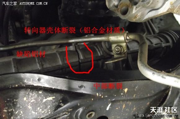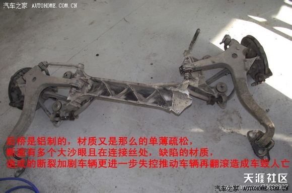 这起事故不单纯是右前轮脱落,左前轮铝悬架球头也轻易脱落,轿车转向器铝合金壳体中部断裂,发动机铝合金机架连接机脚纵向断裂,铝合金后桥支撑大梁粉碎性断裂(断面多处呈现大沙眼