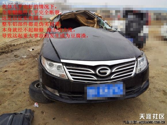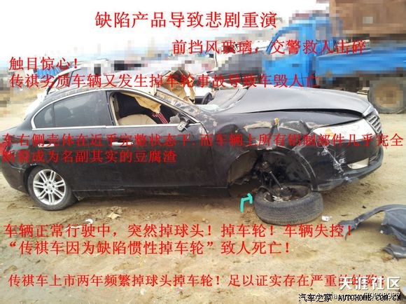 关注过传祺车的人们,是否还记得广州亚运会期间,传祺车队在市区展示过程中,道路平坦宽阔车速慢却阻止不了掉球头掉车轮?厂方强调是司机操作不当撞至铁护栏,请问车辆在撞护栏之前地面上一道长长的划痕是怎么来的?当时网上很多人提出过质疑,请厂方做出合理解释,但是,不是封杀消息,就是垄断回帖,至今没给大众一个合理答复。但是那些支持自主品牌,国产车的市民,选择相信厂家,那只是个“小意外”。可是传祺车在历史的今天,上市不到两年,用一个年轻人的血,验证了它的“价值”。“小意外”变成了“大惨剧”!一个完整的家庭从此失去了阳光与美好。敢问一下,传祺车你真的有宣传的那么“货真价实”吗?这一次瞬间车祸,你整身铝合金部件,几乎“全军覆灭”——断裂的是如此干脆!血与泪鉴证你的成长,真的是成功的吗?消费者选择了你,请你也真诚回报,不管如何发展,请为人们想想,为有血有肉的大众“舍身处地”的考虑一下。材质、做工,你不是个“绣花针”,你承载的是几个、几十个甚至是几百个家庭,泪可以回流,但是生命只有一次,你毁了一个年轻阳光的生命,请你这次真真正正,彻彻底底的给这个家庭,给大众一个合理解释,也为买传祺车的车主们解答疑问,大家期待你!!