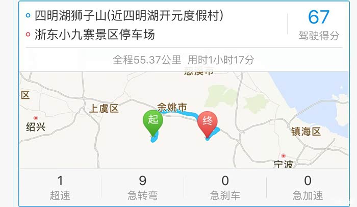 路线:家→外环→沪金高速→沈海高速→杭州湾大桥→S61→S33→N条乡道→梁弄镇→四明湖酒店