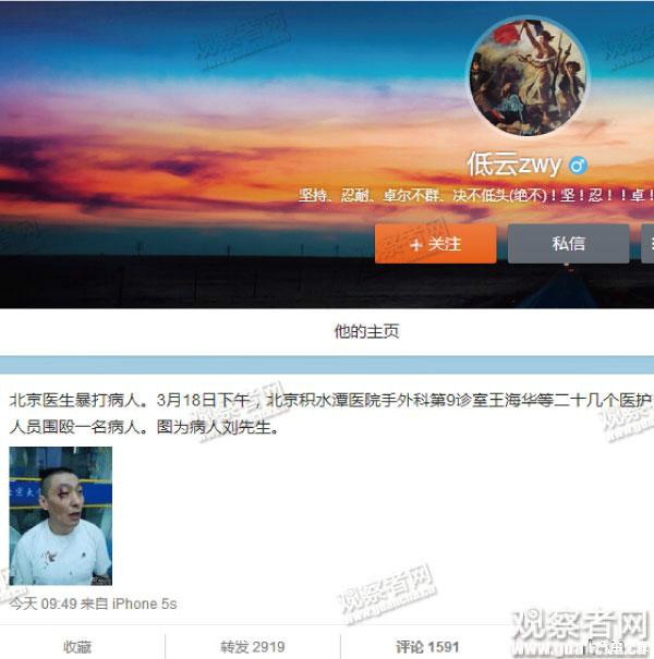 3月19日上午,微博用户@低云zwy 称,“3月18日下午,北京积水潭医院手外科第9诊室王海华等二十几个医护人员围殴一名病人。”并配有一张穿白色T恤男性照片。