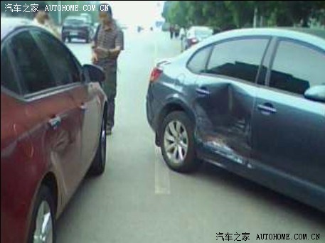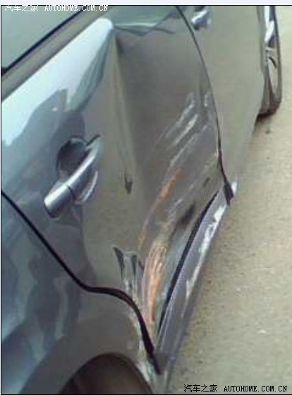 各位嘉友们,今天我由南往北行驶,银行在马路另一侧,我看由北往南的车离我还有一段距离,就打左转向灯准备到那边的银行取钱。越过双黄线后三辆车向我这边驶来,靠左边的两辆车成功避开,悲剧发生在最右边的开别克的一女的,估计她也没专心开车,也没刹车,直接撞上我的嘉嘉的右侧后门,我只听砰的一声,下车一看,嘉嘉好惨,门整个变形了。再看人家的别克车好像没多大问题,就是保险杠擦掉了些油漆,大灯好像也擦坏了点。后来那女的说她马车就是看好这个车耐撞,我当时那个汗啊!难道我的嘉嘉就不经撞吗,以后再也不敢随便越过双黄线了,教训啊!