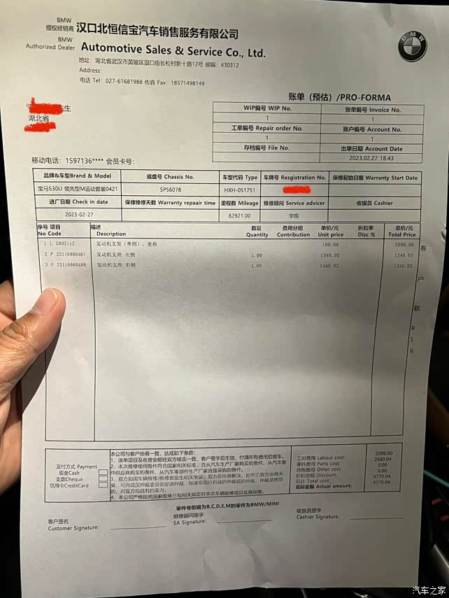 就在回家的路上仪表提示防冻液不足,下车一看底盘花花漏水,这下想起来了B48最大的通病漏水,我也遇到了。叫拖车拖回4S店,换了机油滤芯底座,涡轮增压水管。修了7千多 我都没花钱,2天就修了一万多。回家之后继续做功课新款B48发动机最严重的通病就是漏水、漏水、漏水。不停的漏水。由于设计温度高,加上塑料件用得多,宝马全系搭载了B48发动机公里数到了8万以上 无一例外全漏,最主要的就是机滤底座,水管。 于是我就开始担心了 我的车刚过八万公里,肯定逃不过的,于是自己就动了点小脑筋找4S店售后把容易漏水的配件几乎全换了如下:机滤底座、缸体水管、回水管、水壶、水泵、 之后液晶仪表经常黑屏,这个也是通病 去4S店把仪表总成也换了这个仪表要2.9万,也没花钱。