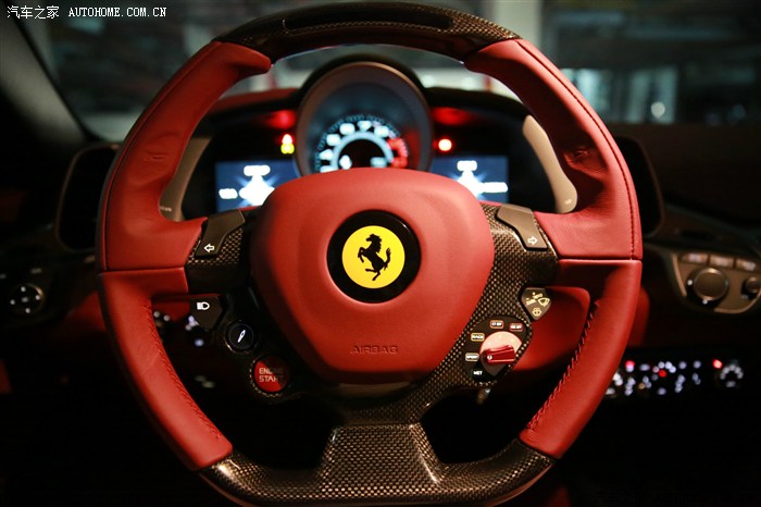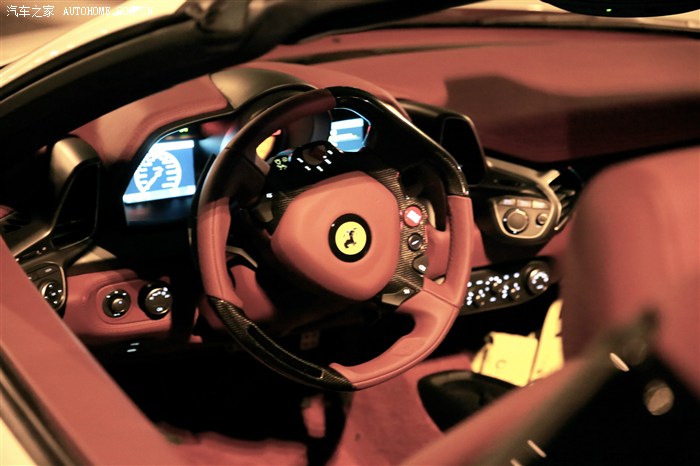 车价就不多说了,这里稍微提一下车子的配置:1.内饰是接近红酒的红,个人认为还是蛮洋气大方的。2. 20寸5幅轮毂,据说这套单卖是9-10W RMB,真是坑爹的价格。没有钛合金的那套有点遗憾。3.方向盘碳纤维 4.方向盘LED换挡灯,这个功能相信大家都懂的。5.车子侧边的法拉利标志,红色卡钳,中央仪表盘红色转速表,车后的458 spider是立体铭板,不是贴纸。基本这些东西已经够了,属于中高档配置了