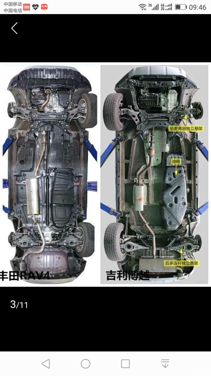 中华汽车是目前全球主流SUV都在使用的底盘,采用贯穿式纵梁的设计,大大提升了整个底盘的连贯性,而且局部的纵梁进行强化处理,使得在碰撞的时候有效高速的传导碰撞力,而且从底盘图中可以看出来这种底盘采用了后置油箱的设计,油箱位比较高,而且下部可以添加防护措施,贯穿式纵梁设计底盘已经是目前设计的趋势。相比之下,博越杂乱无章的“RAV4底盘形态”,早已被市场淘汰
