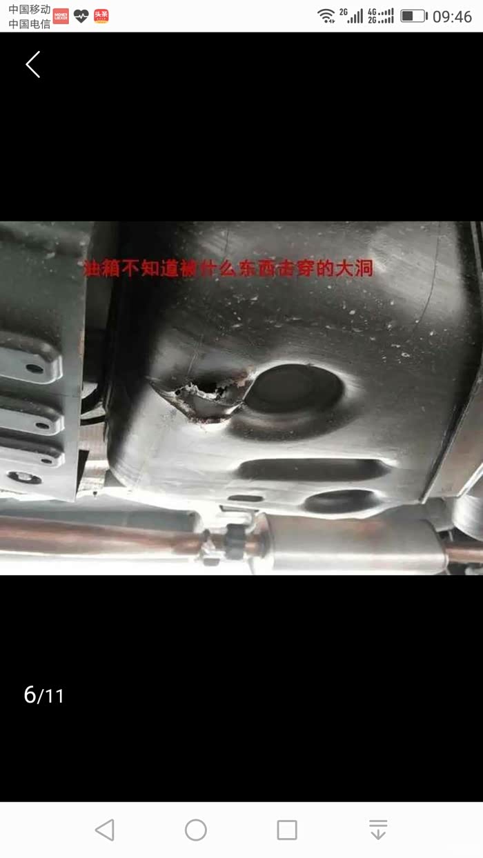 裸露的油箱因为位置较低,加上塑料材质的特性,极易被划破,这台博越的底盘明显被划了大洞,正常行驶的博越当油液泄露完之后停车,最后车主无奈找来拖车去4s店进行售后维修。而博越油箱被刮擦的案例还有很多,从一方面也能看出来其并非个例。