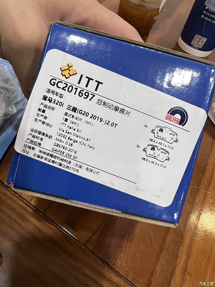 22年8月提的325Li运动版,23年9月开回4S保养,4S检测需要马上更换刹车片,报价1500+,通过车友群告知原厂刹车片就是噶尔法iTT代工,果断京东下单,京东GALFER旗舰店下单,隔天到货预约京东养车更换,体验还不错。纠结了选陶瓷还是低金属,最后选择意大利进口的低金属,原厂同配方