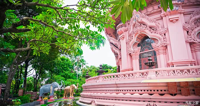 三头神象博物馆为私人所有,馆内有关于主人的介绍,从1994年开始,请了当地的手工美术师花了十多年时间才建造而成。以粉色的外观和博物馆顶上雄伟的三头神象而闻名。到了博物馆附近,远远就能看到高高矗立的神像,三头神像重达150吨,有十层楼高,据说是由纯铜精雕而成,俨然已经成为当地的地标了。博物馆由内而外的粉红也是其近年来越来越火的原因。低饱和的粉甜而不腻,正好符合当下人的审美,所以每天除了信众来参观之外,还有许多游客,比如我们慕名而来哈哈。