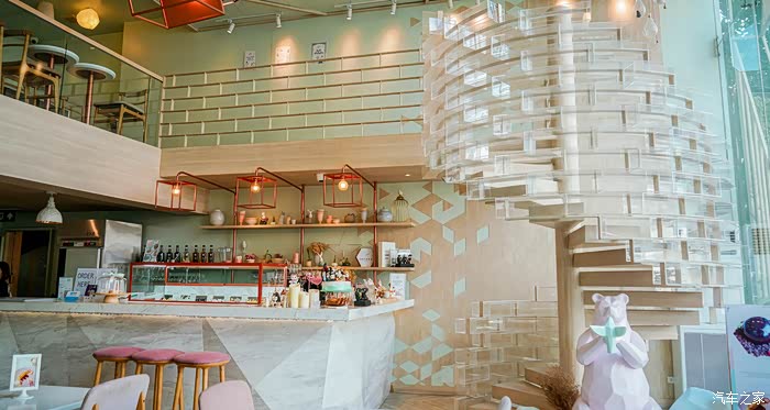 门店装潢以粉绿色及粉红色为主,甜品也多以Tiffany绿为主打色,进来的时候一个人也没有。诺大的空间只有我们俩在放空。
