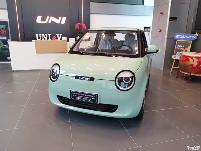 终于有车到店可以看?,第?眼就被他的?眼睛征服?,首先看到糯玉米整体采用圆形作为设计的基础元素,圆圆的车灯配合动漫设计的眼皮,再前扰流口,整个前脸像?个正在做鬼脸的小孩孩,整车在外观部分的设计真的?符合现代的审美;