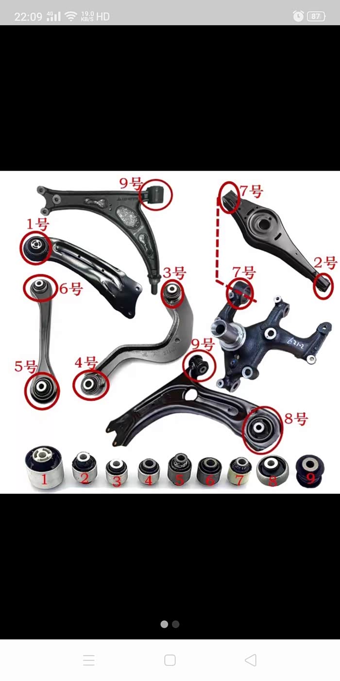 12年明锐1.6AT,里程七万,烂路底盘松散异响,过减速带力不从心。检查四条减震有三条漏油,准备更换。三角臂铝座胶套裂纹老化。小吊杆略有松旷。摆臂球头没有发现旷量。现在的汽修厂只换不修,问了好几家都只换总成,没人愿意换胶套。今天花了一天时间拆了四轮钻车底查看,发现后桥连杆比前桥更多,托臂纵臂弯臂还有直臂都有胶套(借用网上图片),没有拆车也看不出是否老化需要更换,这下傻眼了!其中托臂弯臂联接有偏心螺丝,会影响倾角后束。论坛也没有看到童鞋更换后桥胶套作业,自己钻车底搞估计够呛,还要压出旧套压入新套,路过的车主说说七八年的老车需要换后桥这些胶套么?
