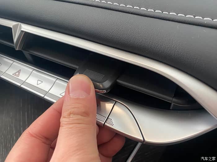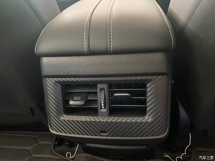 在中央扶手的后面,同样式带有出风口设计,风向支持上下左右的调节。下面还配一个快读充电的U***接头,支持任何品牌的数据线。