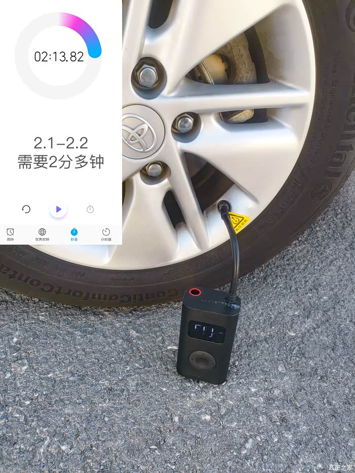 冬天冷了,轮胎也是热胀冷缩,胎压现在降到了2.1(正常是2.5),所以,这时候正好排上用场,测试由2.1打到2.2需要2分多钟,官方数据满电状态可补气:约5条轿车轮胎(215/60R 16轮胎,从2.0bar补气至2.5bar)或者约8条公路自行车轮胎(700×25C轮胎,从0psi-120psi)或者约6条摩托车轮胎(130/70-12轮胎,从0bar充气至2.4bar)或者约30个7号足球(从0psi充气至12psi)。
