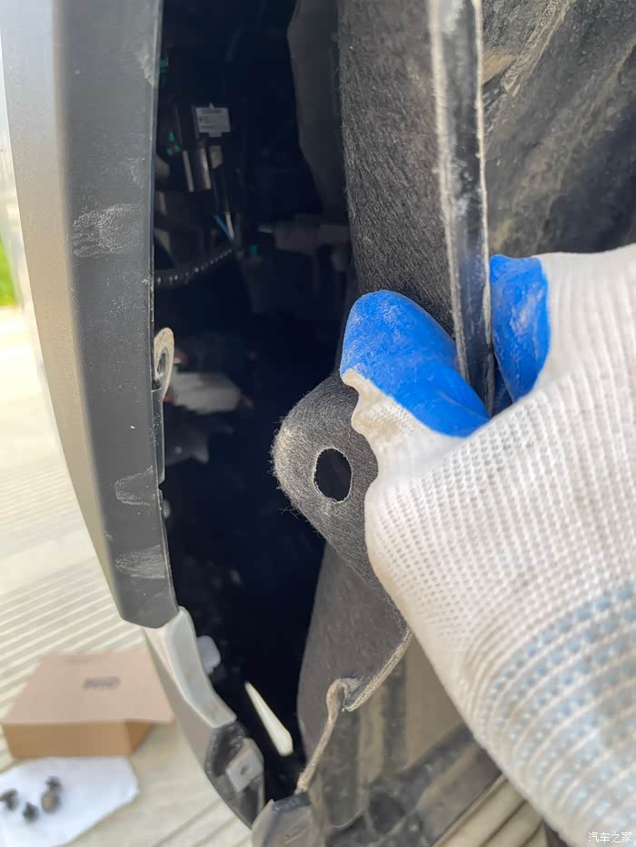 手指处就是要拆下雾灯另一颗螺丝的位置,这个大窟窿就是雾灯拆开后的样子