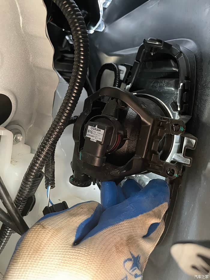 拆开一小部分内衬。可以看到里面的雾灯总成,直接拔掉英文字母下面的雾灯插头,再拧下两颗螺丝就可以拆下整个雾灯。