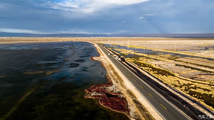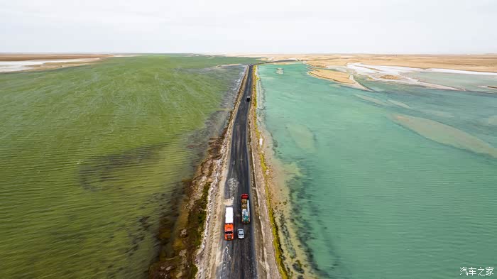 这是315国道从茫崖出来去水上雅丹和东台吉乃尔必经西台吉乃尔,只有从一百米高空能看到左右湖水因含盐量不同而呈现两种不同颜色。这也是西台吉乃尔魅力所在(其实这段湖水近看并没什么特色)。
