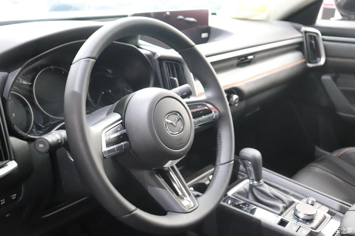 前排出风口造型挺别致的,竟然是竖状的。车内的配色和造型看着比较舒服,在一些设计细节上,马自达也有自己的想法。