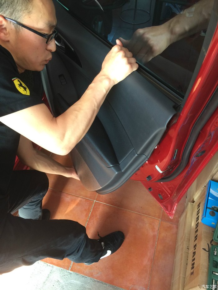 开始拆门了,没经过老板同意把他也照上了,请见谅,老板是很年轻的帅哥,还没对象呢,哪位附近的美女有兴趣可以借改装车的机会去接近