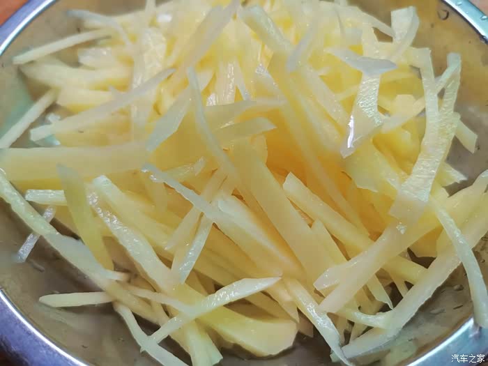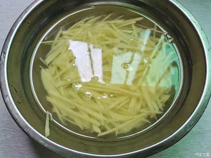 切好丝的土豆放盆里用水泡着,祛除多余的淀粉
