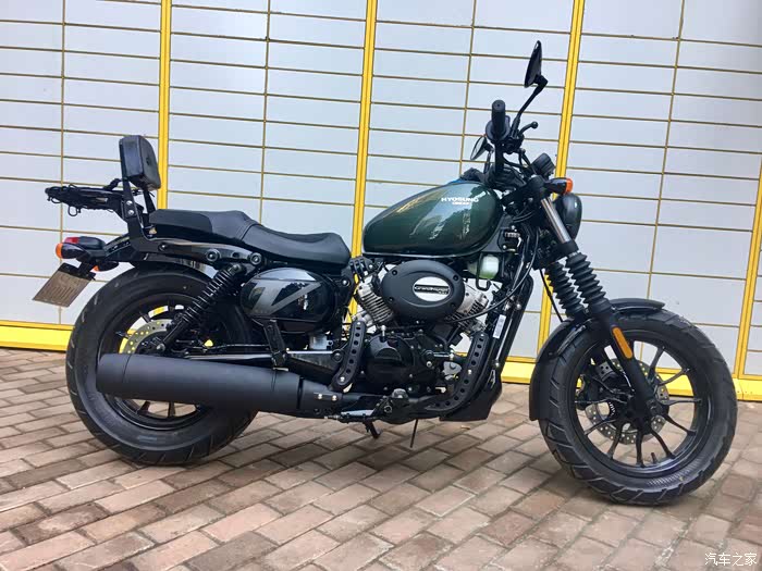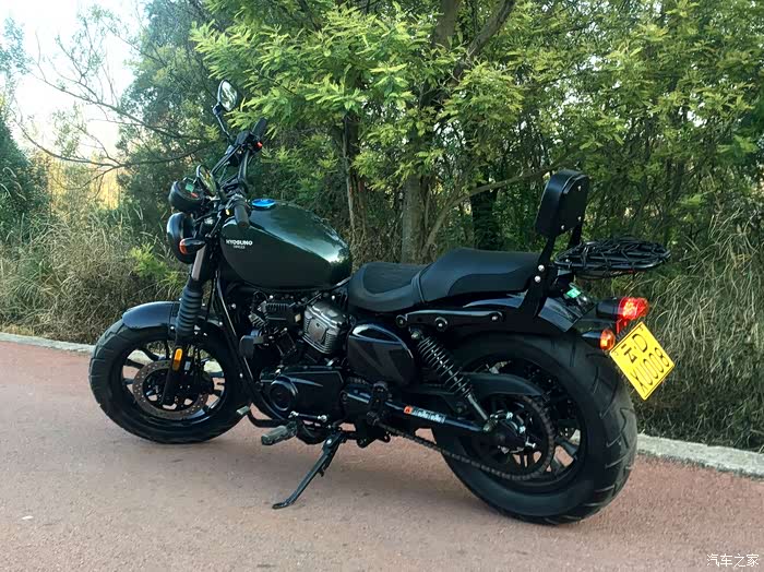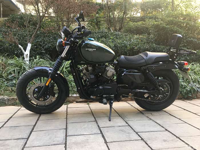 2、韩国晓星的60°V型双缸8气门发动机最大功率:22.1千瓦,最大扭矩:25.6牛/米,扭矩平台宽阔52齿的后牙盘低扭不错,市区通勤提速超车说来就来,发动机气门声有点大,排气声音浑厚不炸,哈雷V缸的马蹄声不明显;