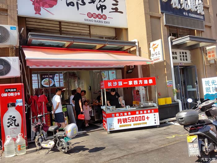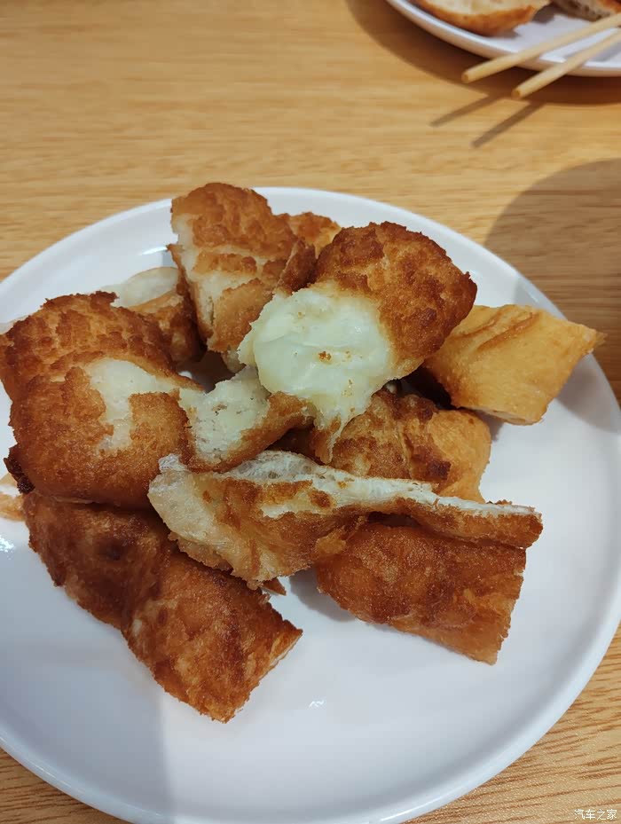 七点多起床,直奔主题,导航7公里,因为路不熟,停好车,下来步行,最后发现店面在一个不起眼的小区了,单门面不大,里面坐满了人,外面还排着队。映入眼帘的就是长沙第一家四方油条,老板在门口现炸,金黄酥脆,香气扑面而来,它不像普通的长方形油条,它是四方形的,没有那么重的碱味,还有点微微带甜!