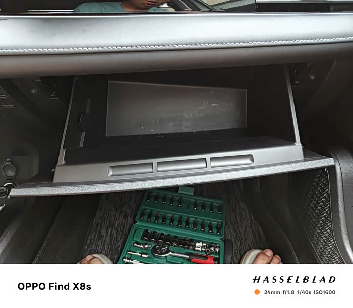 右手边有一个卡扣,我们把它掰开。然后双手扶住副驾驶置物箱两侧向中间用力,置物箱就下来了