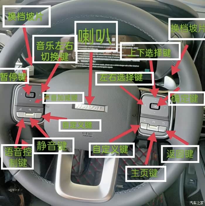 方向盘上的各个按键:切换键、暂停键、语音控制、静音键 自定义键、上下选择键、左右选择键、确定键、返回键、声音加加减键!你学会了吗?