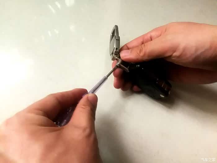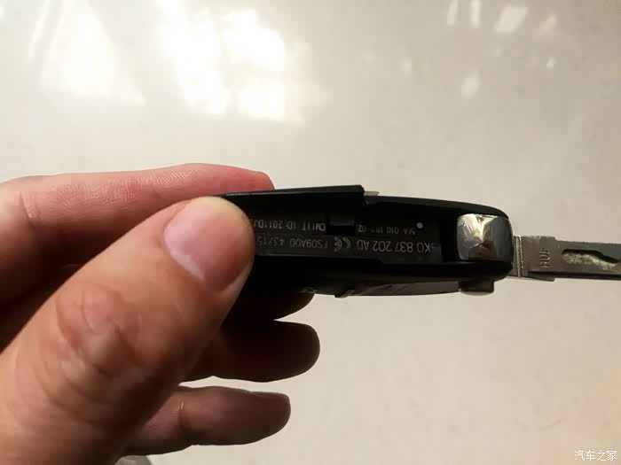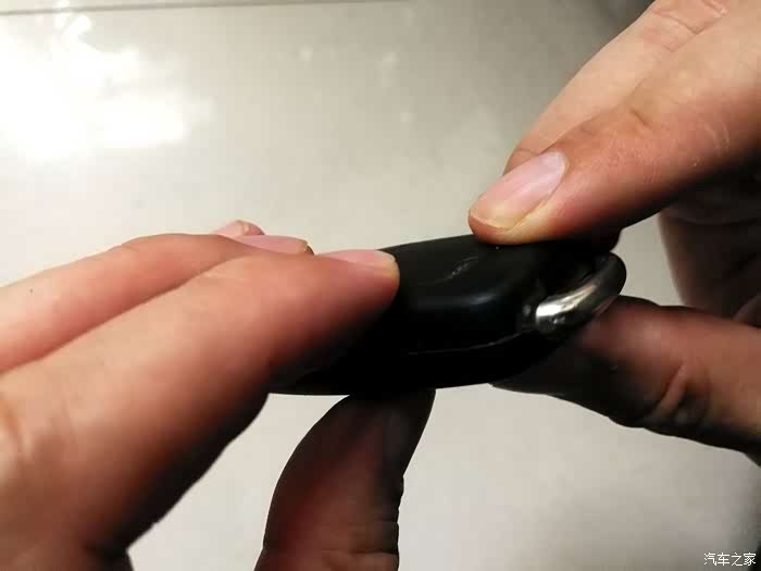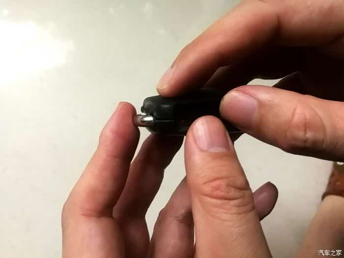 撬开卡扣后,用手慢慢***钥匙的尾部。(很多车友用螺丝刀撬,容易损坏塑料盖板,我用手慢慢掰就能***)