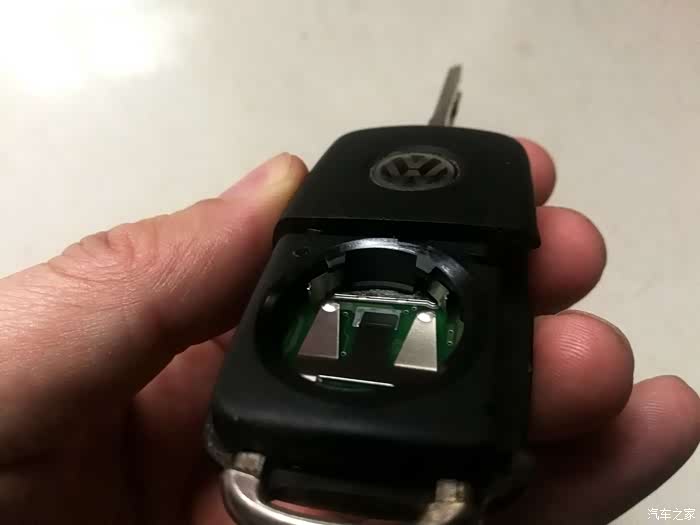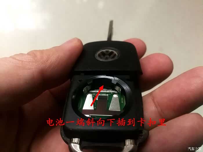 向下一按,纽扣电池深深的固定在汽车钥匙的电池位置