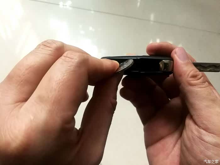 在撬的时候一定要注意硬币要紧靠卡扣位置,这样才有更大的力度把卡扣撬起。撬时要轻轻用力,不要把卡扣弄断。(卡扣断了就不好固定钥匙电池了)