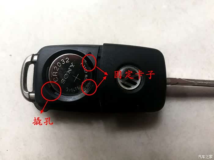 汽车钥匙电池靠两个固定卡子,深深的陷了进去。靠下方有一个凹陷的小孔,我们暂且叫撬孔吧。