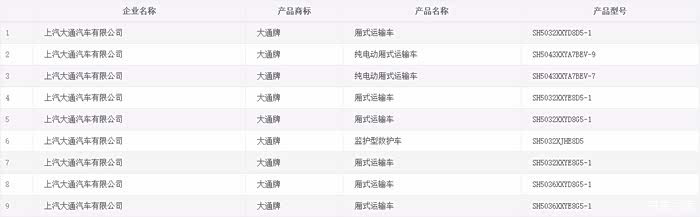 如图,本批次上汽大通汽车有限公司共计申报汽车新产品公告9个,其中V80纯电动厢式运输车(封闭货车)2个(SF5043XXYA7BEV-7、SH5053XXYA7BEV-9),T60多用途货车单排底盘改装监护型救护车1个(SH5032XJHE8D5),剩余6个均为T60多用途货车原厂加装货厢盖(厢式运输车)版