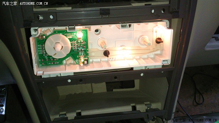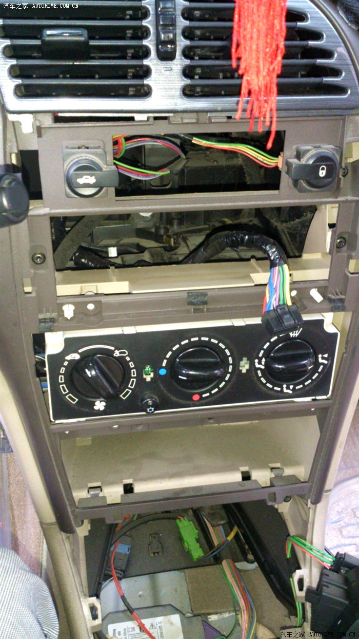 假如有走长途的话。或者在车上开久的话,还是很有用的。也可能各有各的想法吧。有用过的才知道它的好处。下面是用手机照的图。一个人拆还要拍,累。开始不知道怎么拆,也只能是用自己的想法拆,我只要就是要找出AC开关的线,可能走了很多弯路,有谁知道我下面拆错了、请指点一下。谢谢。
