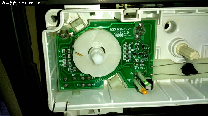 拆掉旋钮。看到调风量开关里面的电路板。我从后面的线要找AC开关的线找不到。只能在AC开关上面找。