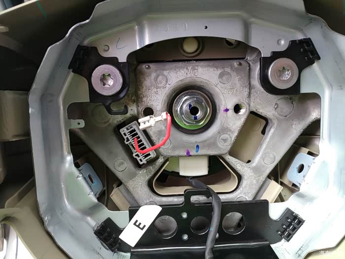 然后把气囊慢慢的拿下来,用小的螺丝刀撬开联接插头,记住要慢,不要接触到中间的铜芯插头,然后慢慢的把带有日产标志的一面向上放置,防止爆炸