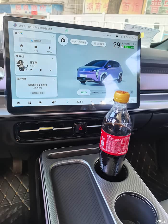 不足的地方。第一,扶手台下方如果再增加点软性材质就好了。第二,水瓶放置的位置,会影响到中控大屏的操作。第三,全景天幕好看,在大太阳的情况下,光线太刺眼了。
