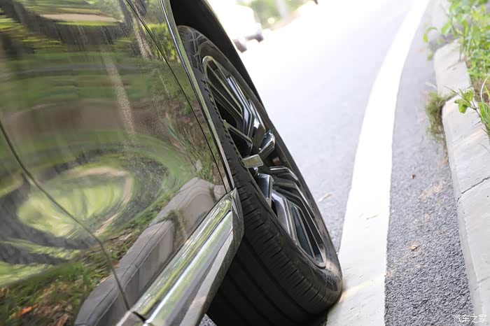 侧面简洁,线条突出,没有过多的花哨,门下方的亮条让车身侧面更显高档,搭配着21寸的宽大轮胎,让我开起来更加的稳健。并配有有胎压显示功能,一旦出现胎压减弱,可以即使发现,再也不用担心跑在高速路时轮胎憋了的状况发生在自己身上,让自己开起来更加的安心。
