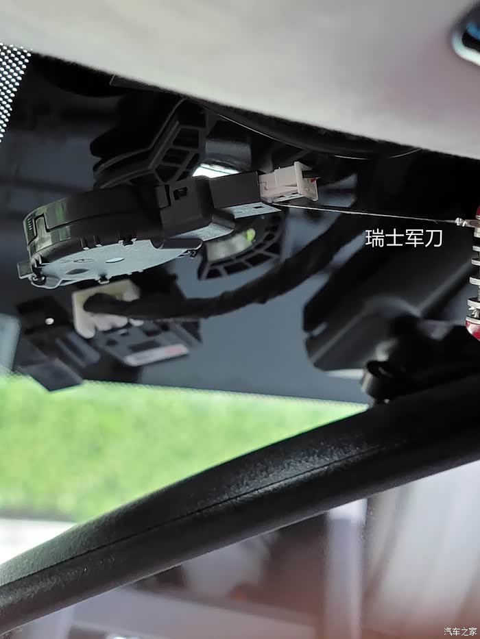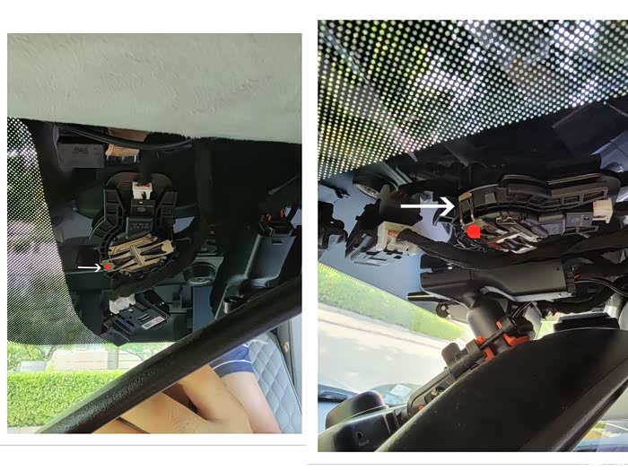 在“红点”处向风挡玻璃方向轻推,用军刀从箭头处撬开卡簧。