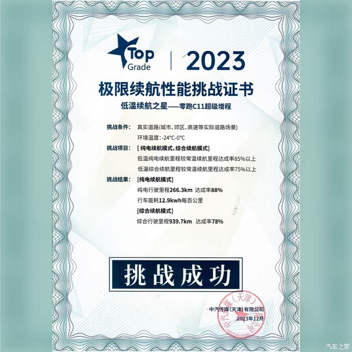 TOP Grade极寒续航,零跑C11超级增程车型在真冬测中不仅仅是完成了普通的续航测试,更是迎接了一个更高的挑战:TOP Grade极寒续航。这个挑战要求在极寒温度下,零跑C11超级增程车型能够实现零补给的穿越东三省。