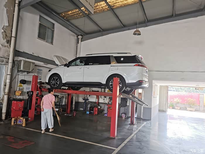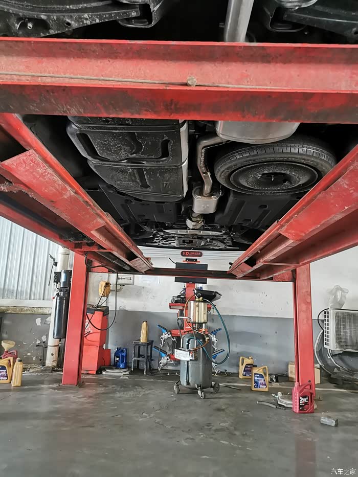嘉华开上举升机,准备开始换机油。