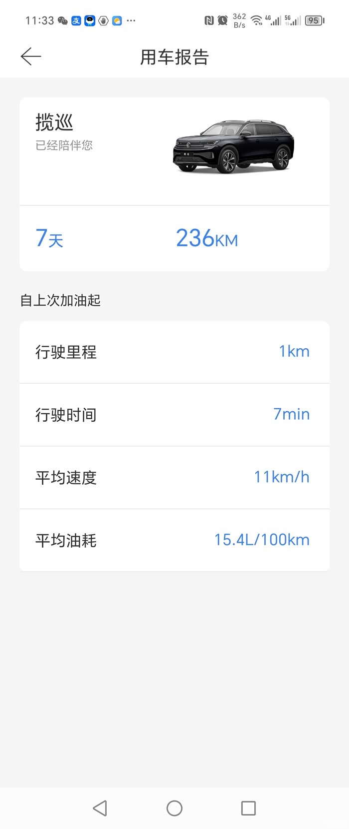 开了一个星期,感觉油耗降不下来,每次开车平均都只有11个油,但这个一汽大众APP只显示最后1次的油耗,第一次加300元,昨天还剩100KM就提示需要加油,也就是300元能跑336公里对吧。这个油耗到底高不高呀?