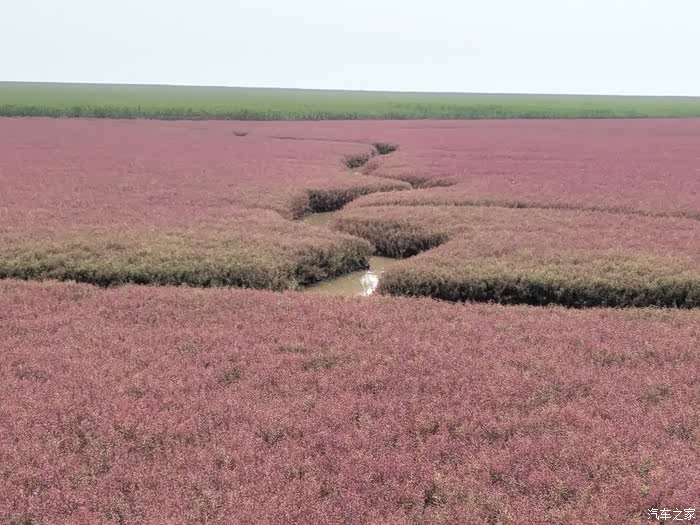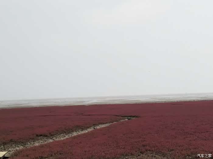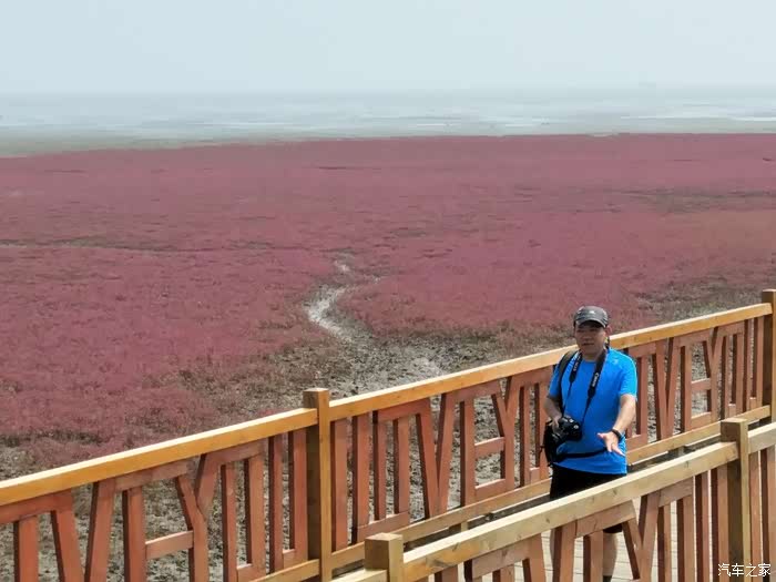 我们赶往红海滩,红海滩位置辽宁省盘锦市大洼县赵圈河乡境内,属于湿地生态旅游景区,罕见的红海滩,芦苇荡为依托,是自然景观和人文景观的完美结合。红海滩是一棵棵纤柔的碱蓬草织就而成,她每年4月份长出地面,开始是嫩红,渐渐地转酒红,9、10月份有浓红变紫。她不需要人撒种耕耘,一簇簇,一蓬蓬,在盐碱地里生长,年复一年地生生死死,死死生生,酿造出一片片火红的生命色彩。上午9点多我们到达红海滩国家廊道风景区,人很多排队买票,进入景区后,我们乘坐上小火车观赏着道路两边的风景,右边是一片片红红的红海滩,左边是一片片绿绿地芦苇荡,游客都拿出相机和手机,不时地拍照录像。开始没有太阳,天气不是太好,我们乘车来到了红海滩最红最好看的景点。下车后我快步走上古色古香的木栈道上,被眼前的美丽景色所吸引,拿出相机一阵狂拍,放眼望去,一眼望不到边的一大片红红的红海滩、红毡般的碱蓬草之间弯弯曲曲的水沟露朝天、青青的芦苇、再远处是白色的大海、时而飞翔的海鸥、还有造型各异的设计图案建筑,低头看看脚下稀少的盐碱地里,能够看到一个个小洞洞,小螃蟹忙忙碌碌的在泥眼儿进进出出,只可惜7月份还不是吃螃蟹的季节,稻谷也没有成熟,我们没能吃到稻田肥蟹,看看红海滩也不枉此行。中午的太阳好热,红海滩隔路相望是大片青青的稻谷田地,我们登上观景台,微风吹着,天气也没有那么热,站在木楼上放眼望去,稻谷地里不像种植的庄稼,倒像是一幅幅的栩栩如生的画面,这是在耕种时别具匠心的种植成画面,漫步在稻田地里像是人在画中游感觉。我有些累,美丽的风景让我们忘记了时间,我们走出景区已经2点多了。买了海咸鸭蛋,吃了两碗方便面。午休后,下午我们就我往家赶,晚上在辽宁葫芦岛市锦州市,我们找了一家可以看海的旅馆住下。停好车,我们步行来到海边,海边一家挨着一家的海鲜餐馆店,摆放着新鲜地海鲜,现卖先做,我们买了些新鲜地海鲜,餐馆老板给我们做好,吹着海风吃着海鲜,喝点小酒好解馋也解乏。休息。