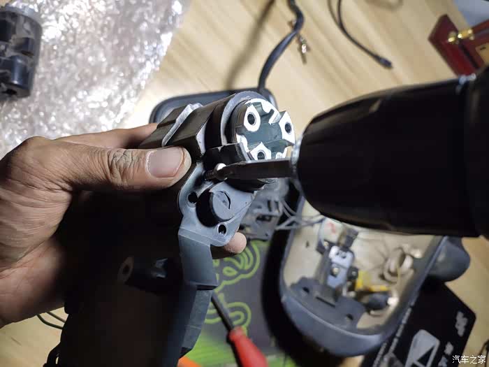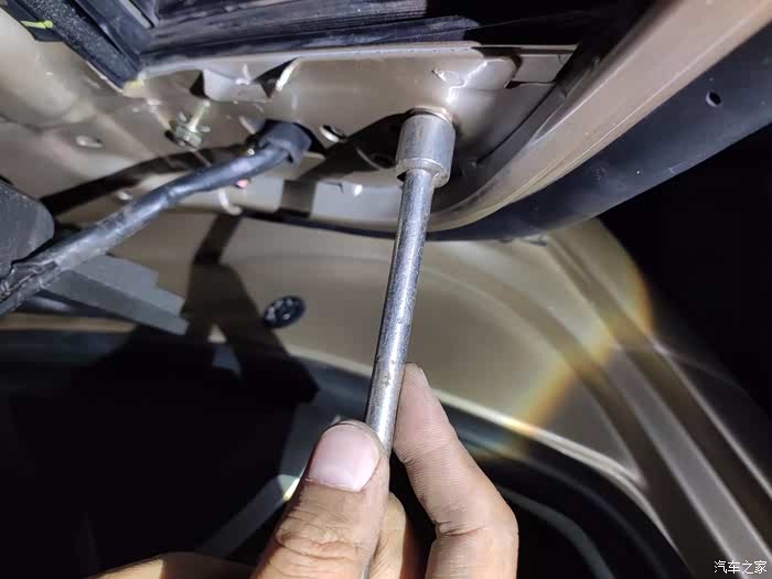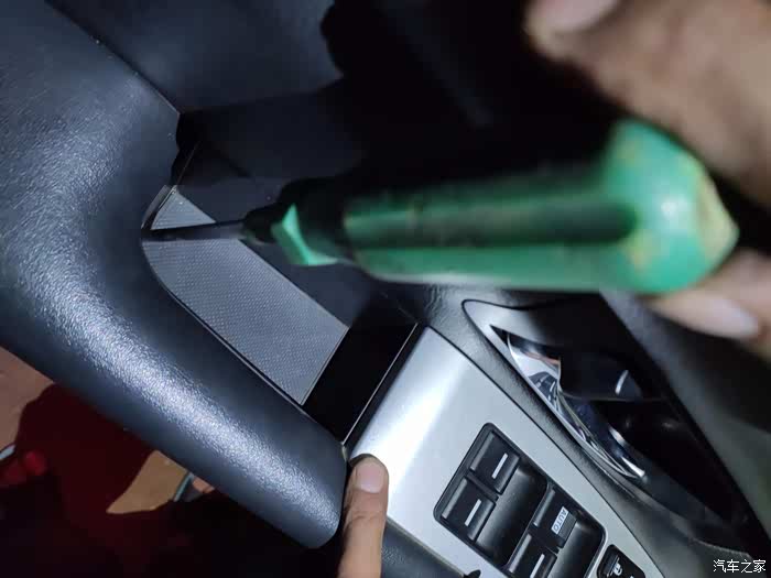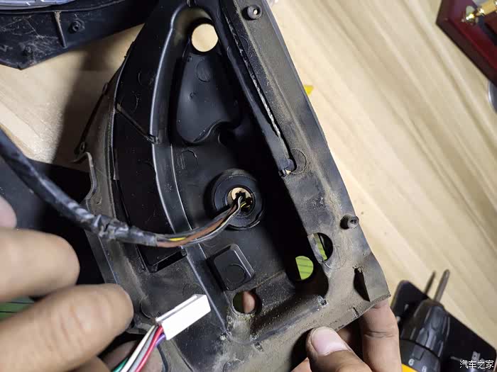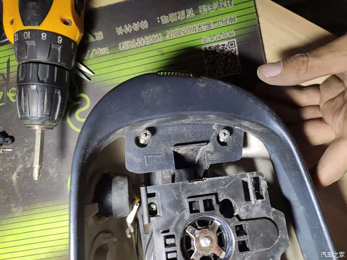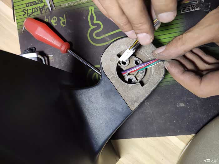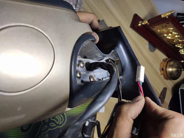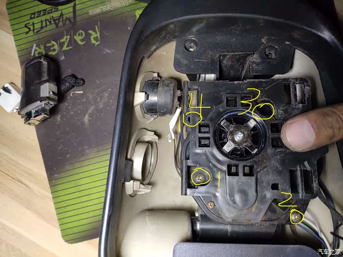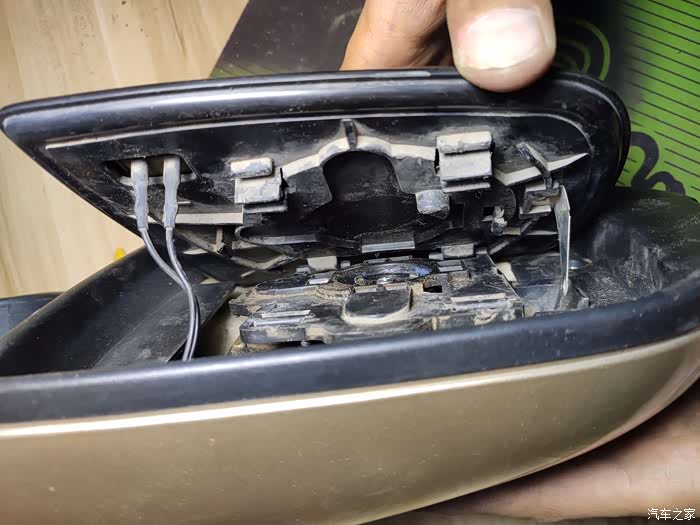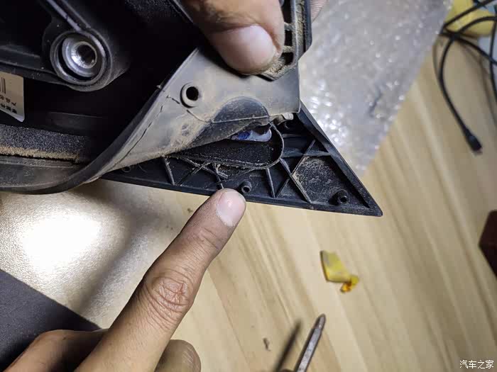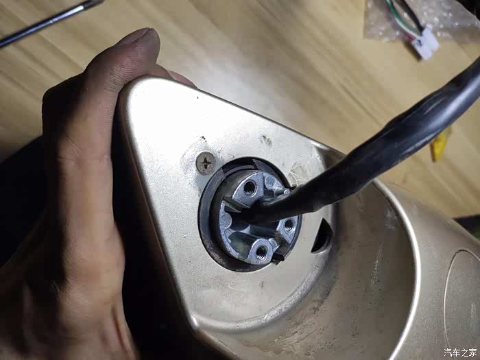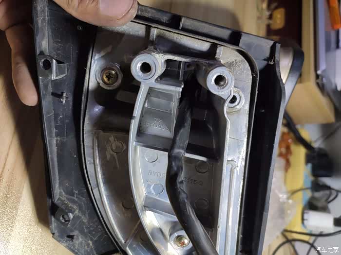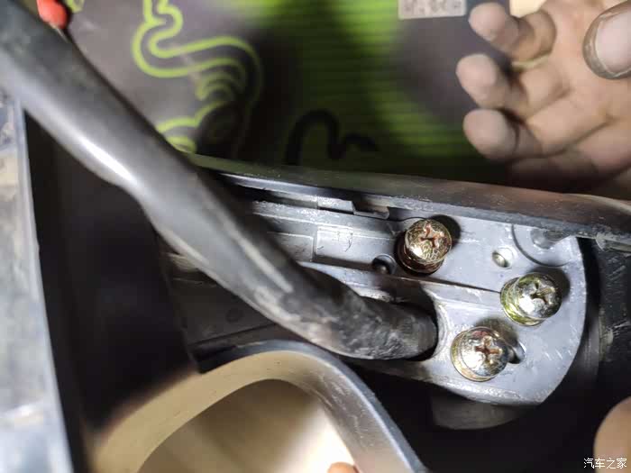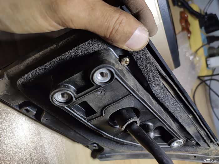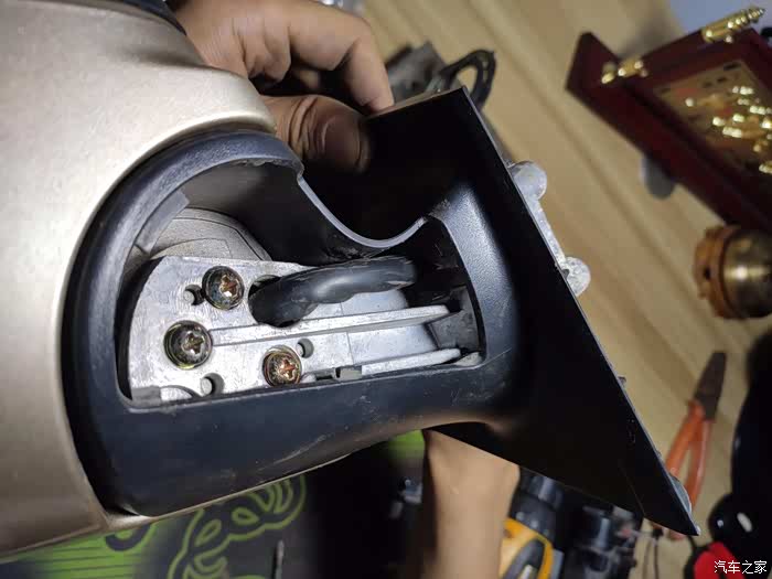 这个上面也是一块小板,没有螺丝,撬下来后有三个10号螺丝,拧下来后,外后视镜就可以拿回家慢慢换马达了